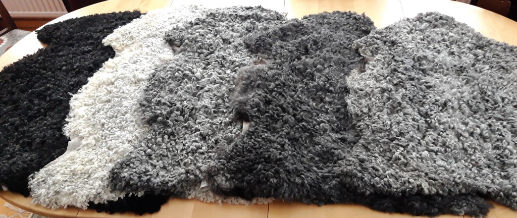 Fem plädklippta lammskinn i olika nyanser i priser från 1500 kr till 1800 kr. Alla skinn är tvättbara. Beroende på pälshåret är de lämpliga som babyskinn, att ha i en soffa, i bilen eller på golvet.
